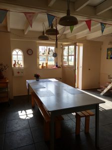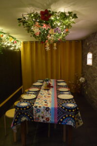 En als alles klaar is kunnen we aan tafel. In een gewone eetkamer? Nee hoor, natuurlijk niet.